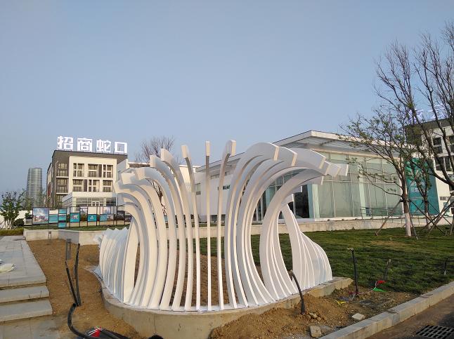 烟台《招商-依云水岸》海浪不锈钢雕塑景观, 采用现代雕塑语言设计,以楼盘形象、定位,整体设计配套。不锈钢制作主体,白色氟碳漆饰面。效果表现现代感较强,对应楼盘位于海边特点,总数三组约60余米。昌林雕塑(13853539222 微信同号)2018-4-28制作。