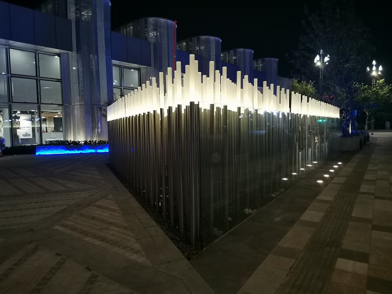烟台亚东柒号文创园 316不锈钢发光灯柱景观 高2.3米 昌林雕塑2021年制作安装