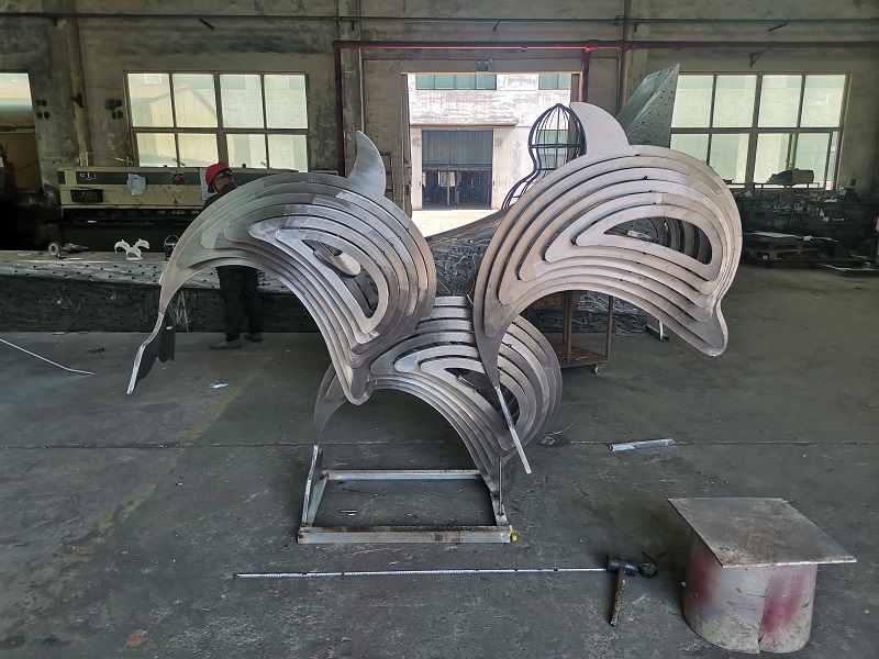 烟台雕塑 烟台开发区乐橙小区不锈钢雕塑 海豚雕塑 材质2mm304不锈钢 拉丝 昌林雕塑2023年制作安装